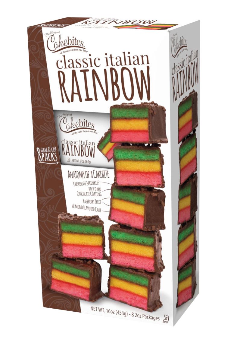 Classic italian rainbow cake bites are now available everyday and everywhere.